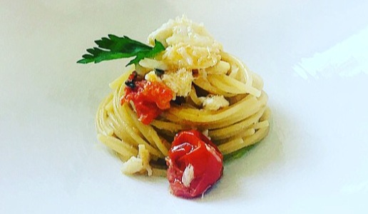 370g bronze wire-drawn spaghetti, 300g of unsalted and skinned cod fillet, 1 garlic clove, 4 piennolo tomatoes, parsley, oregano, salt, hot chili pepper, 5 ample tablespoons of extra-virgin olive oil and ½ glass of white wine.